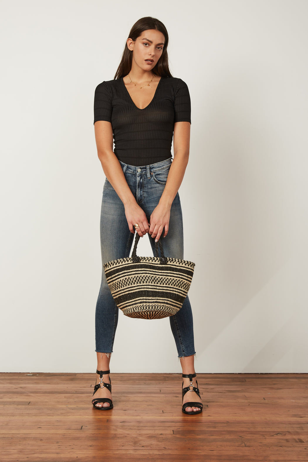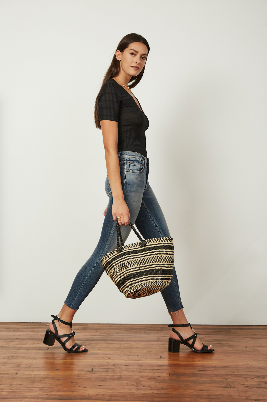 The Riley is a mid-rise stretch skinny jean in a medium wash with a raw hem. This jean includes Recycled Cotton reducing its carbon footprint and reducing water.