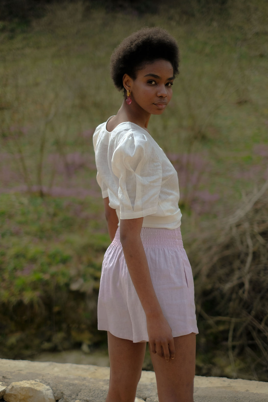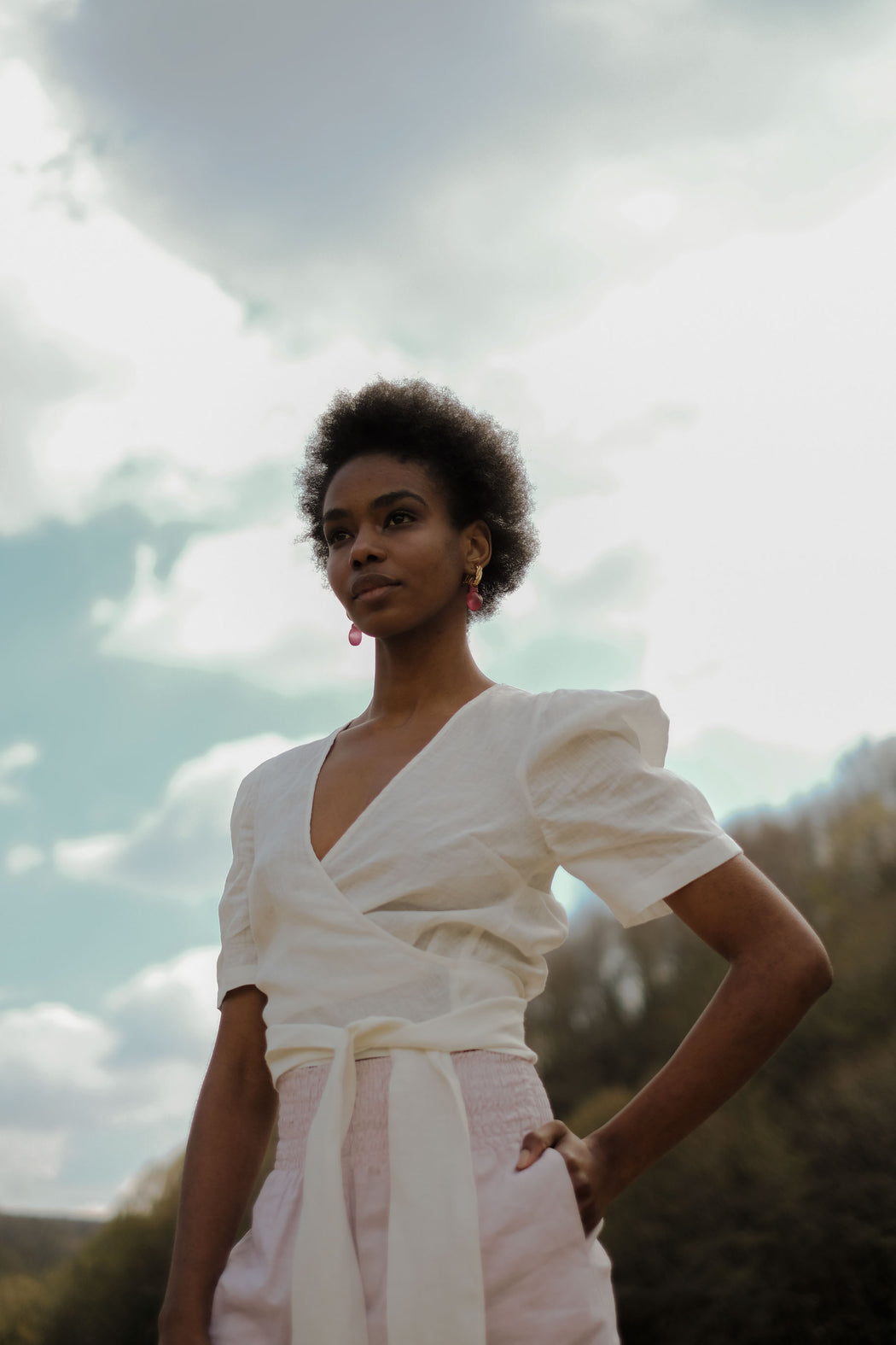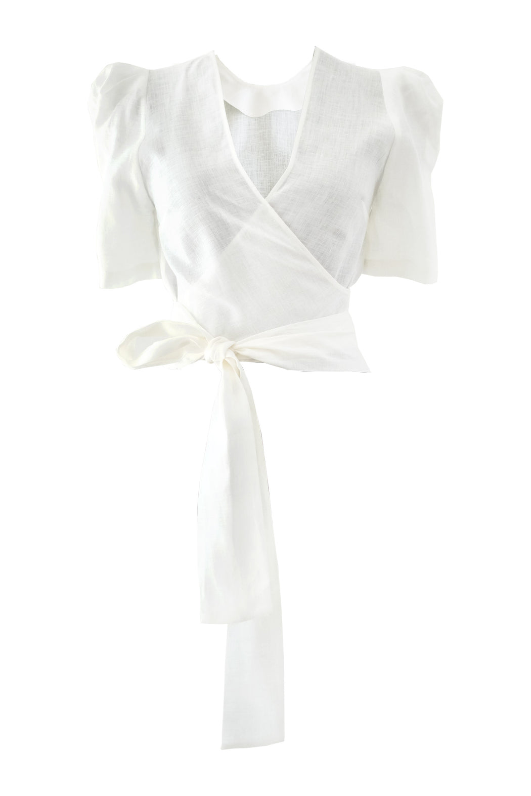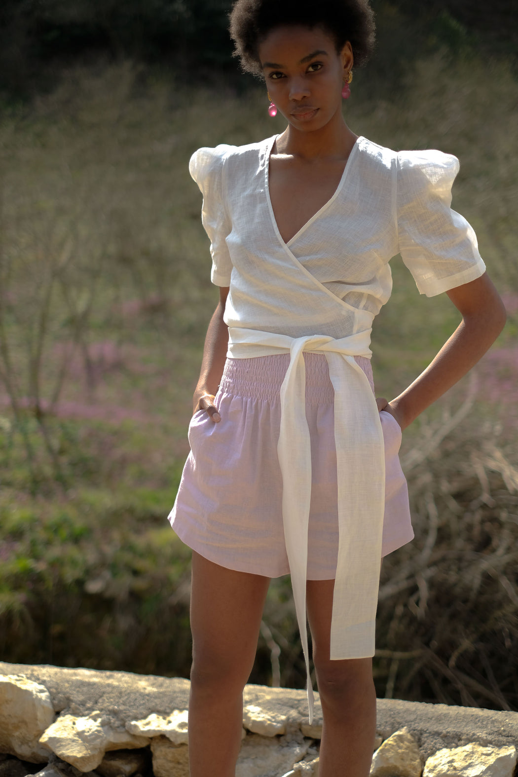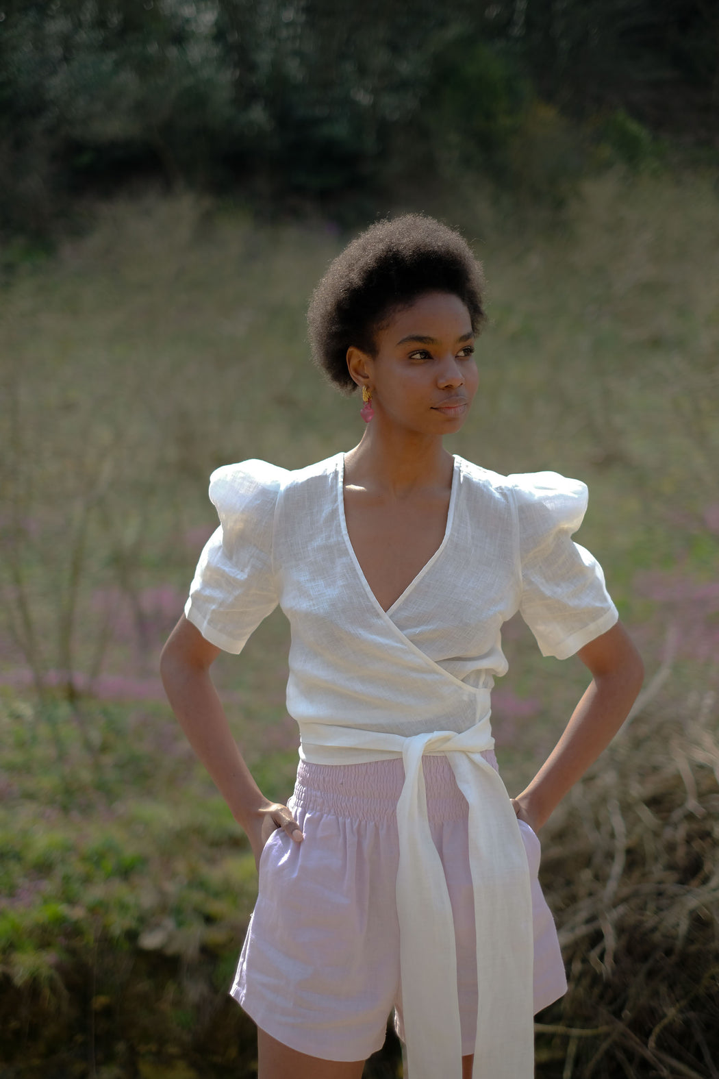 This puffer sleeve wrap top can be worn 6 ways and counting. With darts in the front and back, the blouse can be worn comfortably both ways. The extra-long wraps can be tied into a bow or wrapped around for more coverage. Layer it over your favorite summer dress or wear it solo!