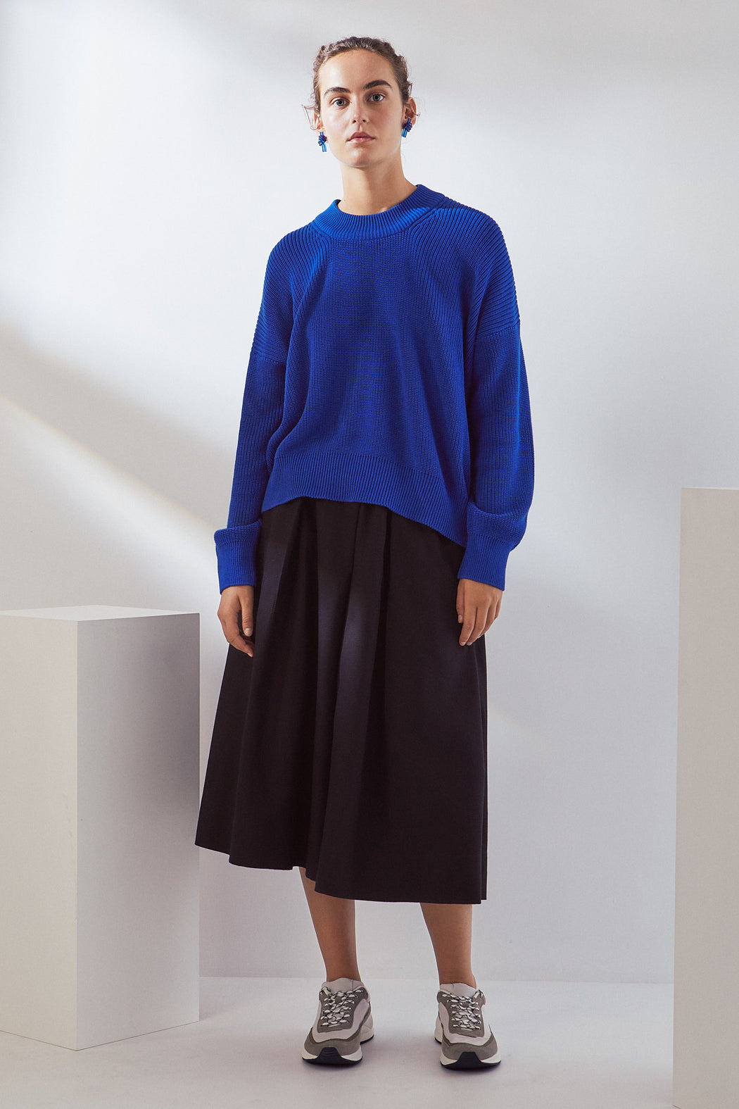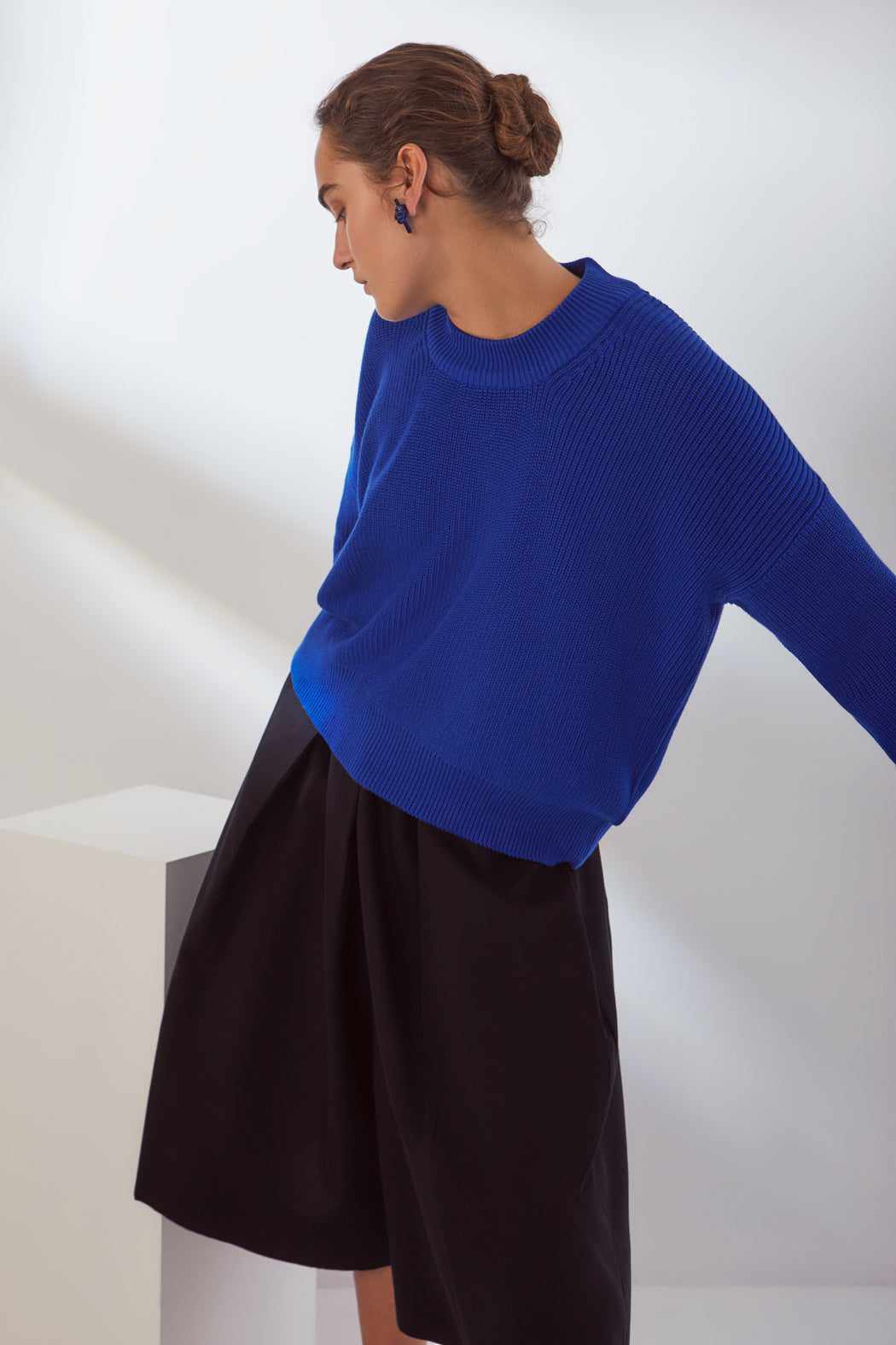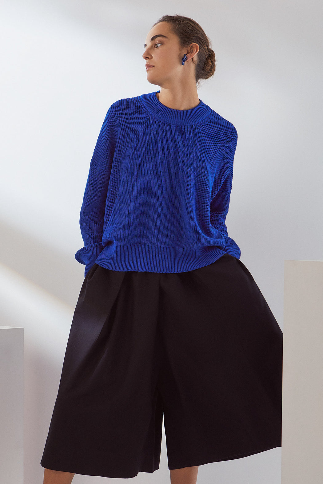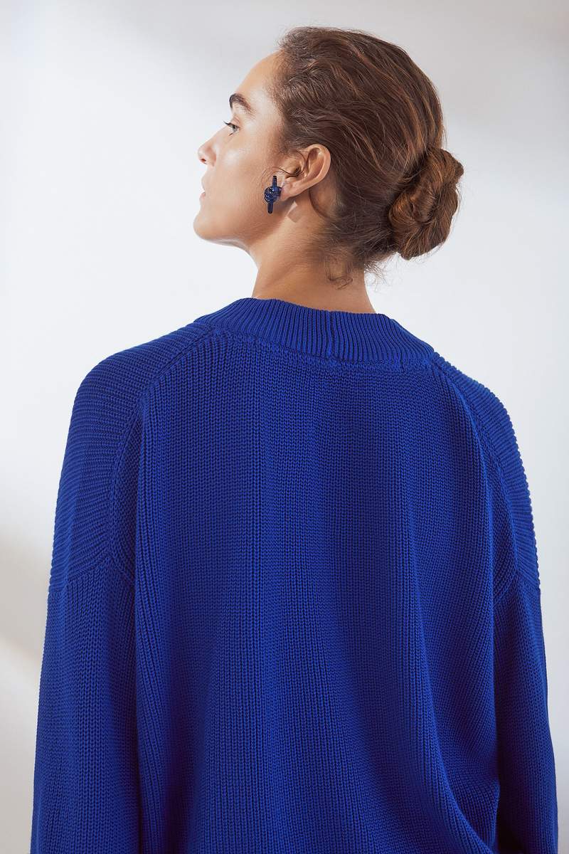 A relaxed knit jumper made from organic cotton. The jumper has a drop shoulder and is finished with a wide ribbed neckline, hem, and cuffs.